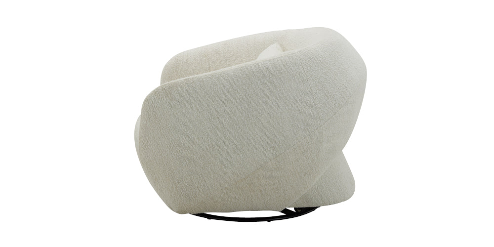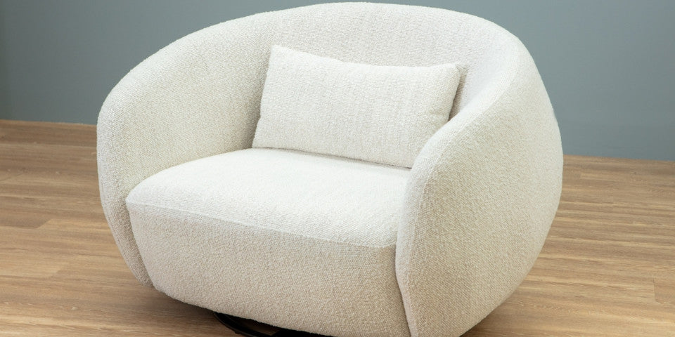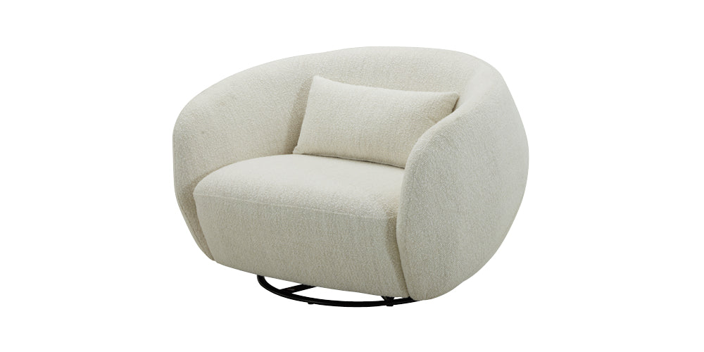 Get cozy with our Miller Swivel Armchair in Fabric, designed with ultimate comfort in mind. The extra-deep seat offers generous space, while the wrap-around curves create a cocoon-like cradle. Complete with an integrated lumbar cushion for lower back support, it’s the ideal spot to snuggle in. With smooth 360-degree swivel rotation, the Miller lets you effortlessly engage in endless conversations from any angle, all while being nestled in the chic, textured bouclé upholstery. With no invitation needed, the Miller proves that when it comes to lounging, more is definitely more!
