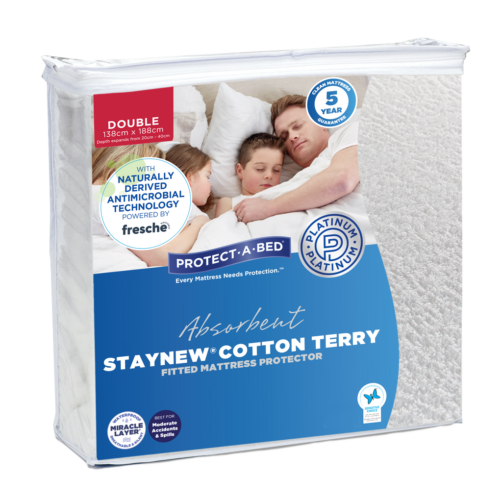 Protect-A-Bed® StayNew mattress protector has a terry towelling sleep surface and features a unique waterproof Miracle Layer™. You won’t even know you have waterproofing on your bed. Soft, comfortable and breathable, StayNew let’s air vapours but not spills and stains through.