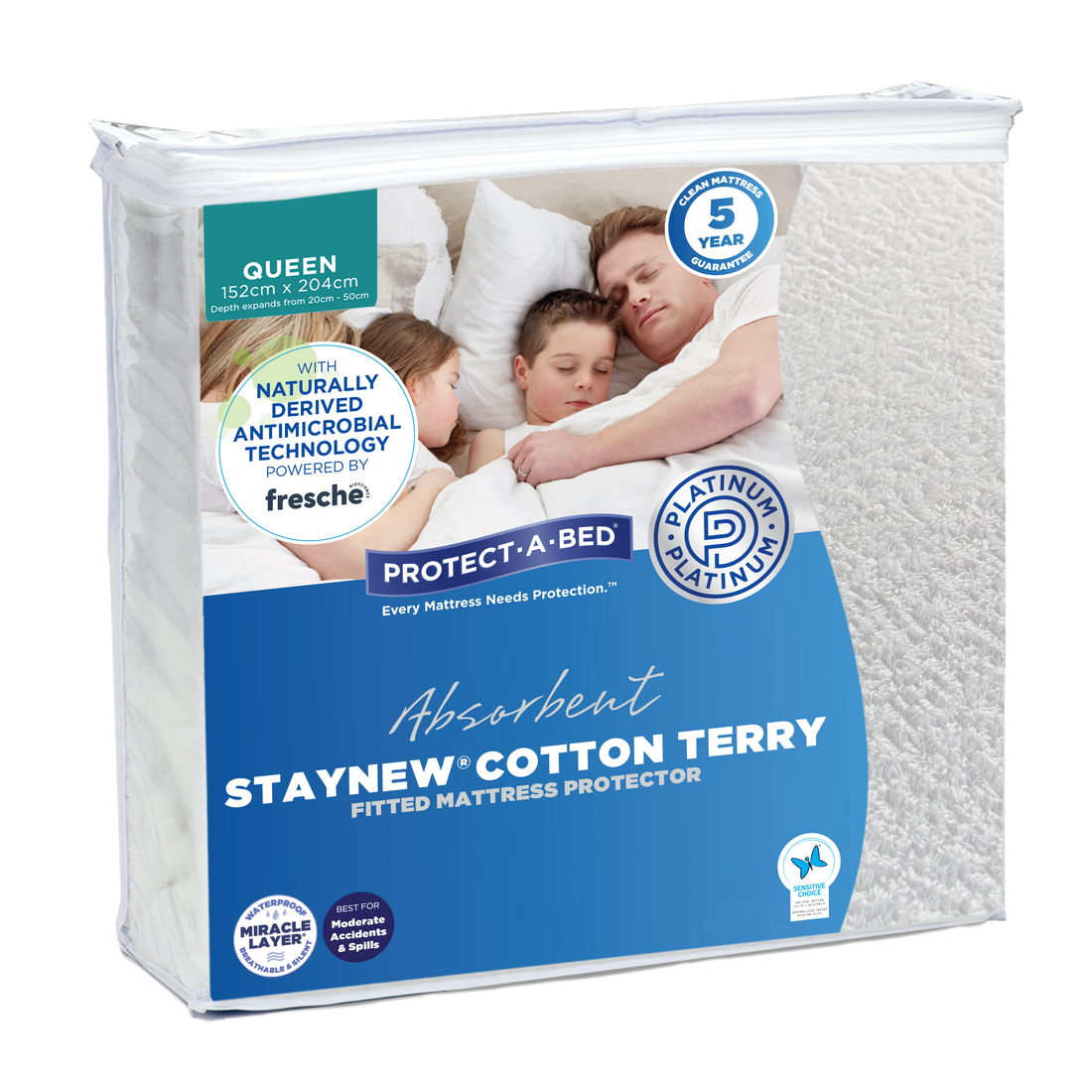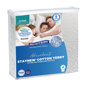 Protect-A-Bed® StayNew mattress protector has a terry towelling sleep surface and features a unique waterproof Miracle Layer™. You won’t even know you have waterproofing on your bed. Soft, comfortable and breathable, StayNew let’s air vapours but not spills and stains through.