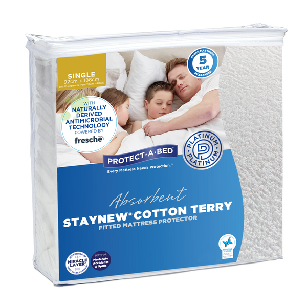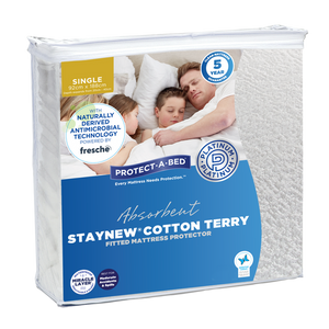 Protect-A-Bed® StayNew mattress protector has a terry towelling sleep surface and features a unique waterproof Miracle Layer™. You won’t even know you have waterproofing on your bed. Soft, comfortable and breathable, StayNew let’s air vapours but not spills and stains through.